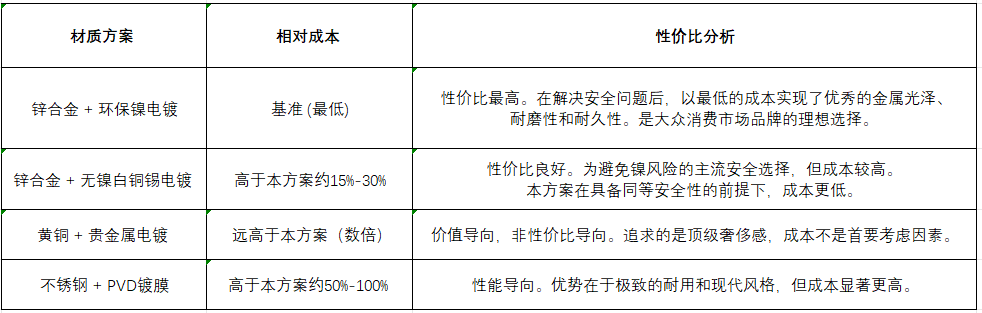 1. 成本極致優化: 鋅合金基材與鎳電鍍工藝的組合,是經過市場驗證的成本最優解之一。
